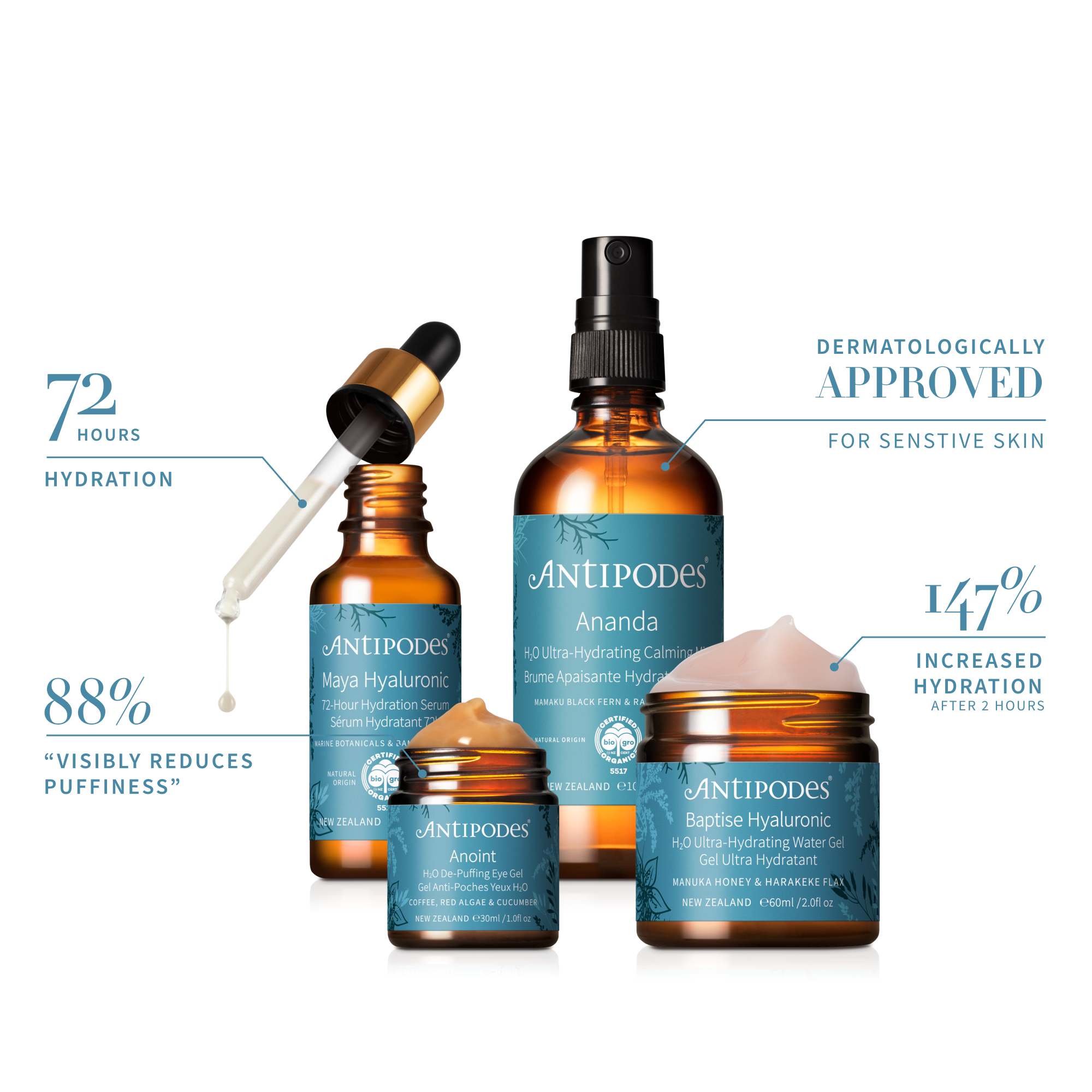 我們的保濕系列產品主打天然植物性透明質酸,採用高科技發酵製程製成。這種親膚成分不含人工合成成分,易於肌膚吸收,且 100% 零殘忍。
